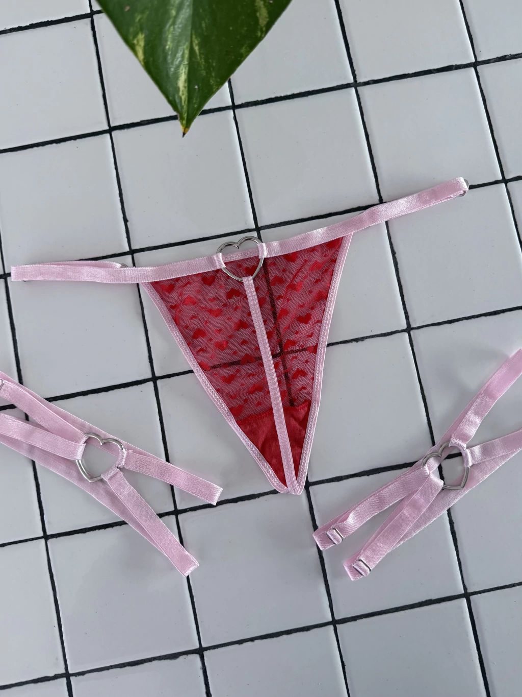 Tanga hilo dental tiro medio de plumetti corazones. Breteles rasados y reguladores corazón. Avío corazón en espalda. Talle único regulable del XS al XL. Refuerzo 100% algodón.